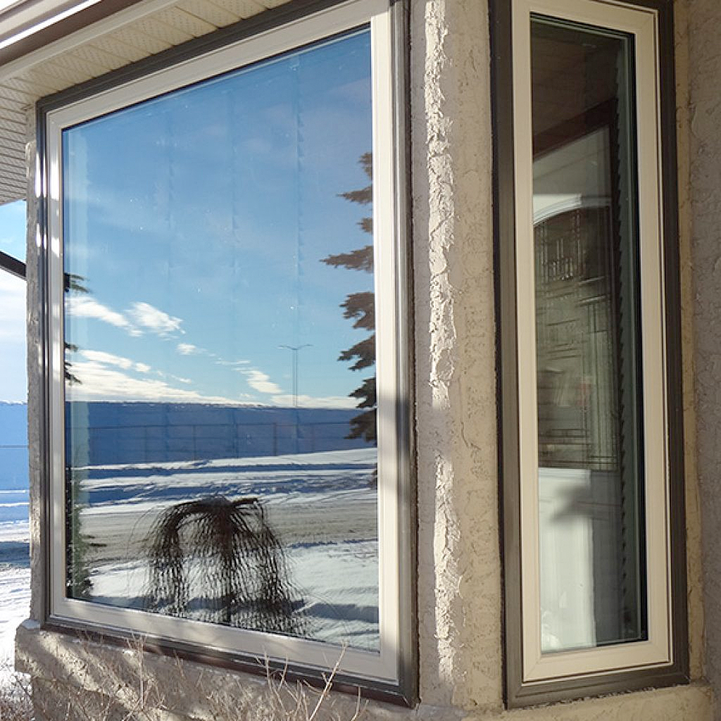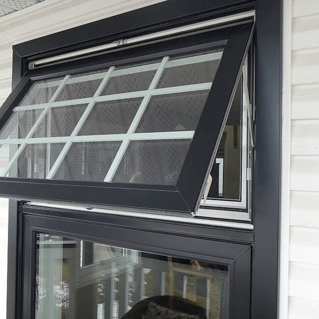 Vinyl Window With Black Capping TrimWindow is Black exterior, White interior and Low E dual pane glass. White grilles between the glass on the awning window.