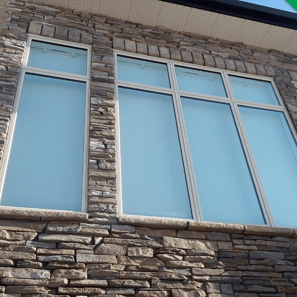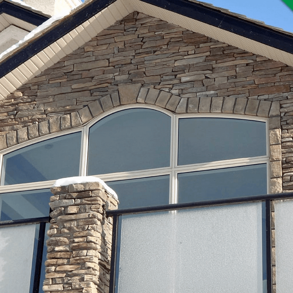 Large Specialty Picture Window With No TrimStone up against window frame. Window is Desert Sand exterior, White interior with Low E triple pane glass.