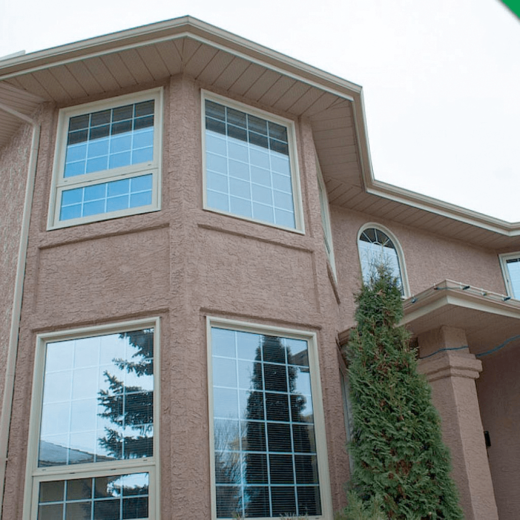 Full Exterior RenovationDesert Sand vinyl windows, white interior with white grilles. Simply Yours sprayed stucco with new paint, did fascia, soffit, eavestroughs and roof.