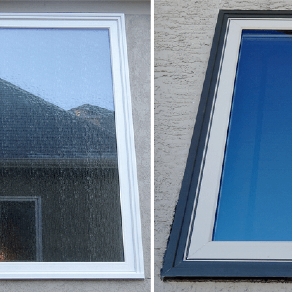 Vinyl With Brickmould TrimOne is solid white, while the other is two toned, both white interior. The white window has Low E obscure glass, while the two toned one has Low E triple pane glass.