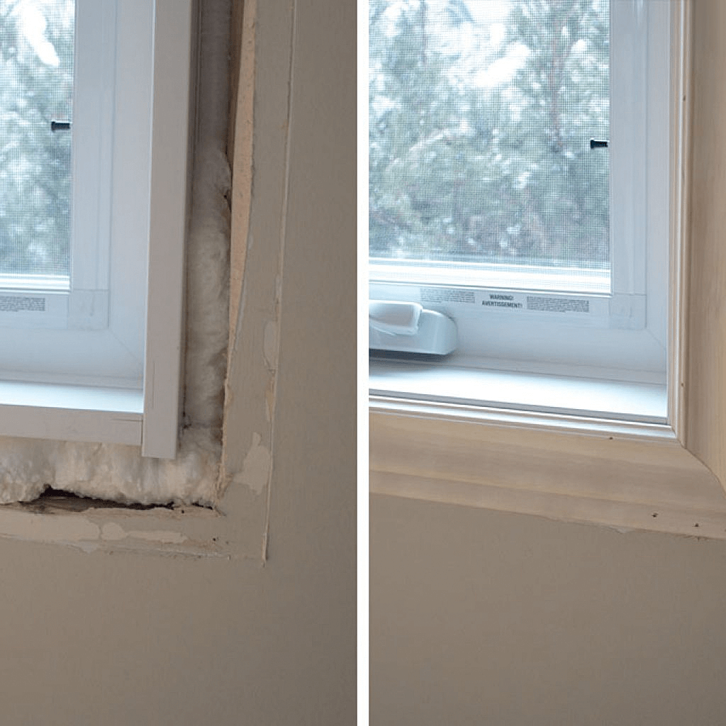 White Vinyl WindowLeft photo: spray foam that adds insulation. Right photo: window finished with interior primed casing trim.