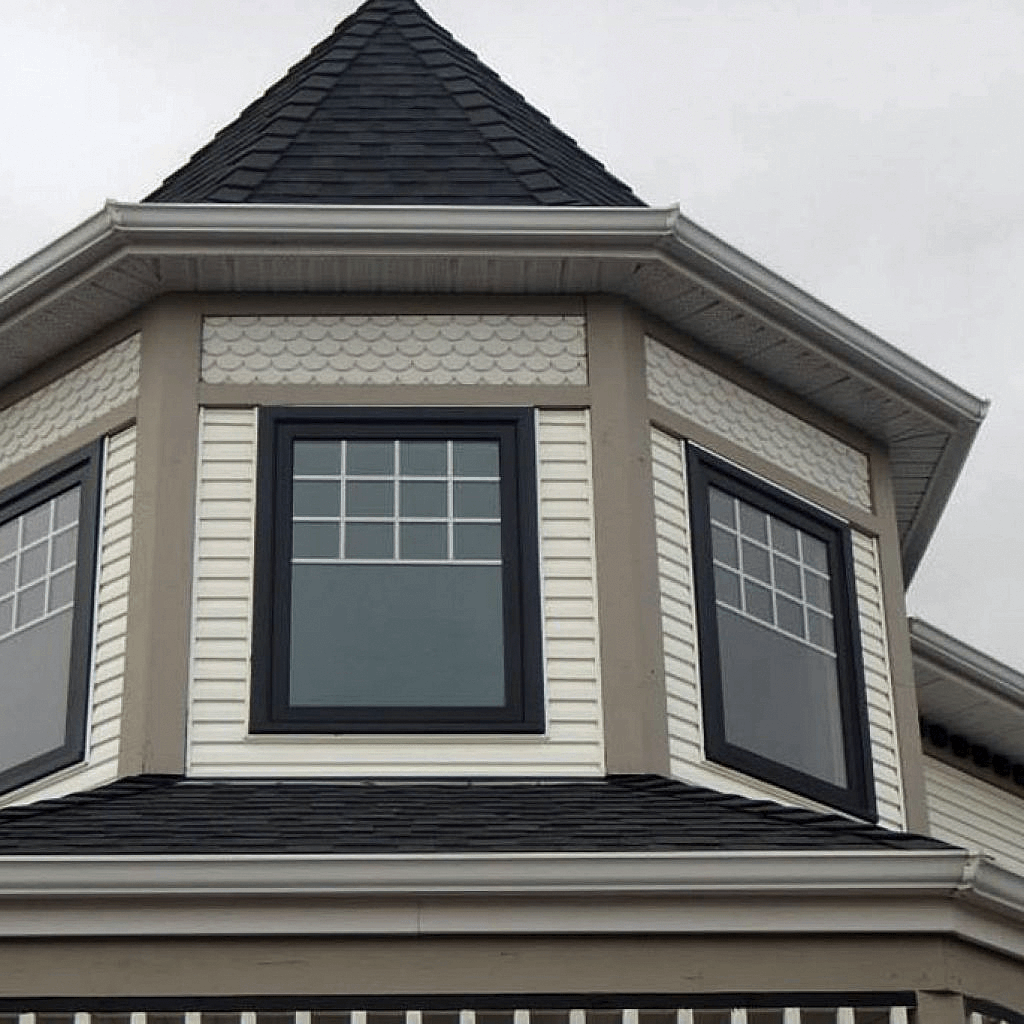 Vinyl Windows With Black Capping TrimWindows are Black exterior, White interior and Low E dual pane glass. White grilles between the glass.